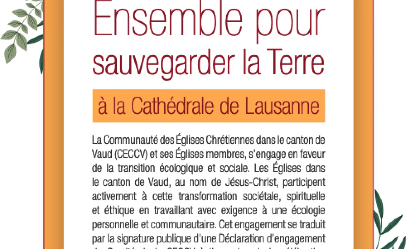 La Communauté des Églises chrétiennes dans le canton de Vaud (CECCV) et ses Églises membres, s’engagent en faveur de la transition écologique et sociale. Elles vous invitent toutes et tous, toutes générations confondues à partager et à soutenir cet engagement dimanche 2 octobre 2022 à la cathédrale de Lausanne.